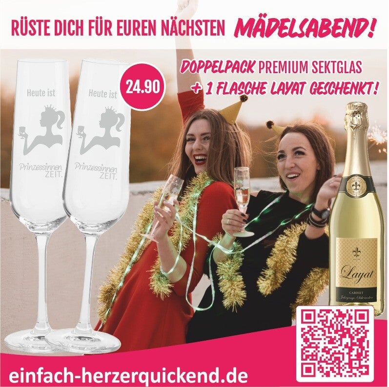 Heute ist Prinzessinnenzeit. Zwei Sektgläser mit schickem Schriftzug und einer Flasche Sekt gratis dazu, damit ihr ordentlich anstoßen könnt. Stylisch, elegant und perfekt für jeden besonderen Moment. Erhebt euren Mädelsabend zu einem majestätischen Moment.