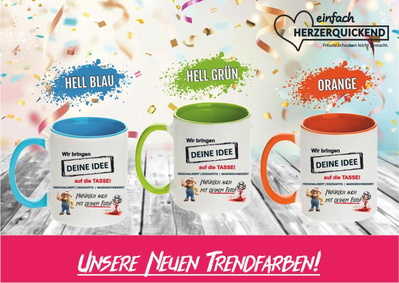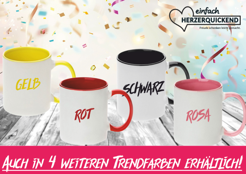 Verleihen Sie Ihrem Kaffeegenuss eine ganz persönliche Note mit unseren individuell gestalteten Tassen! Diese einzigartigen Tassen sind nicht nur außen ein Blickfang, sondern überraschen auch mit einem farbigen Henkel und Innenleben.